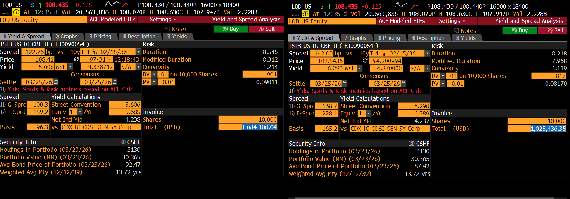 Source for LQD ETF and US 10 yr Bond Yield Analysis: Bloomberg Terminal as of 3/24/2026