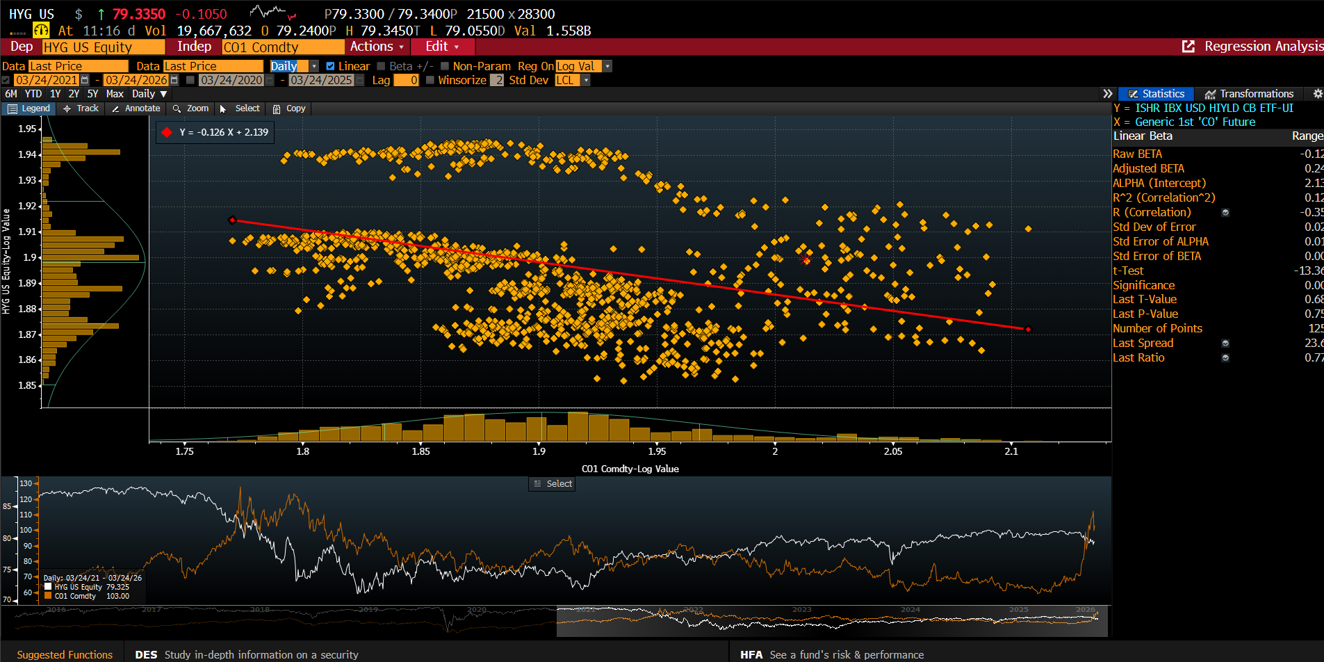 Source for HYG ETF and Brent Crude Historical Regression Analysis: Bloomberg Terminal as of 3/23/2026