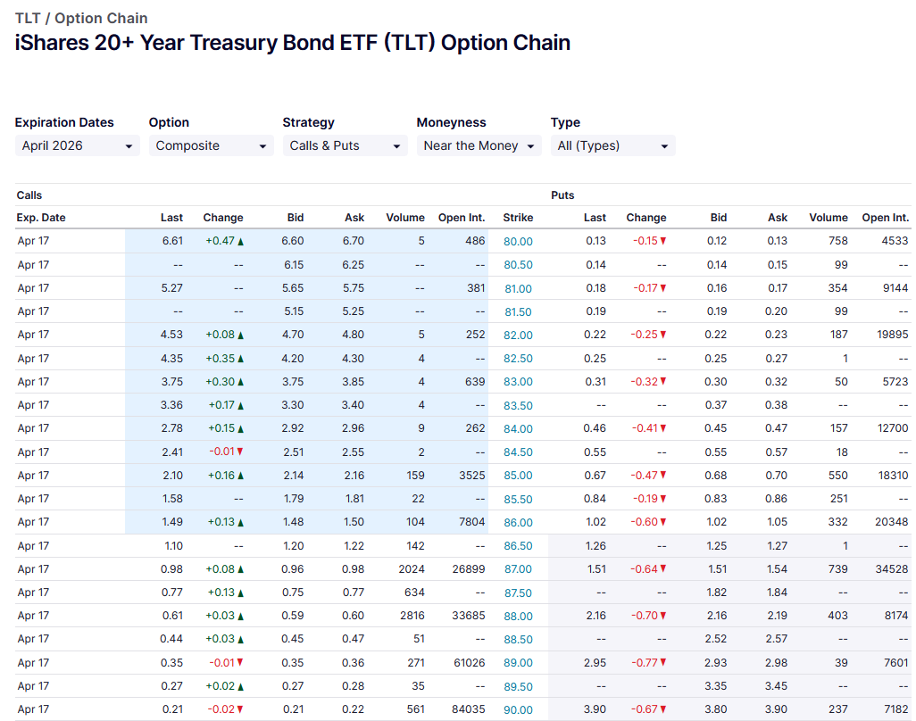 OTM credit collars on TLT are enabling institutional investors to hedge against asymmetric downside skew in the near term (mid April 2026), while still participating in approximately 17bp of upside on their current long bond exposure. Positive carry (+0.05 net) in a world where most hedges cost institutions premium — rare and relatively attractive optionality. Source: Nasdaq.com as of 03/23/2026
