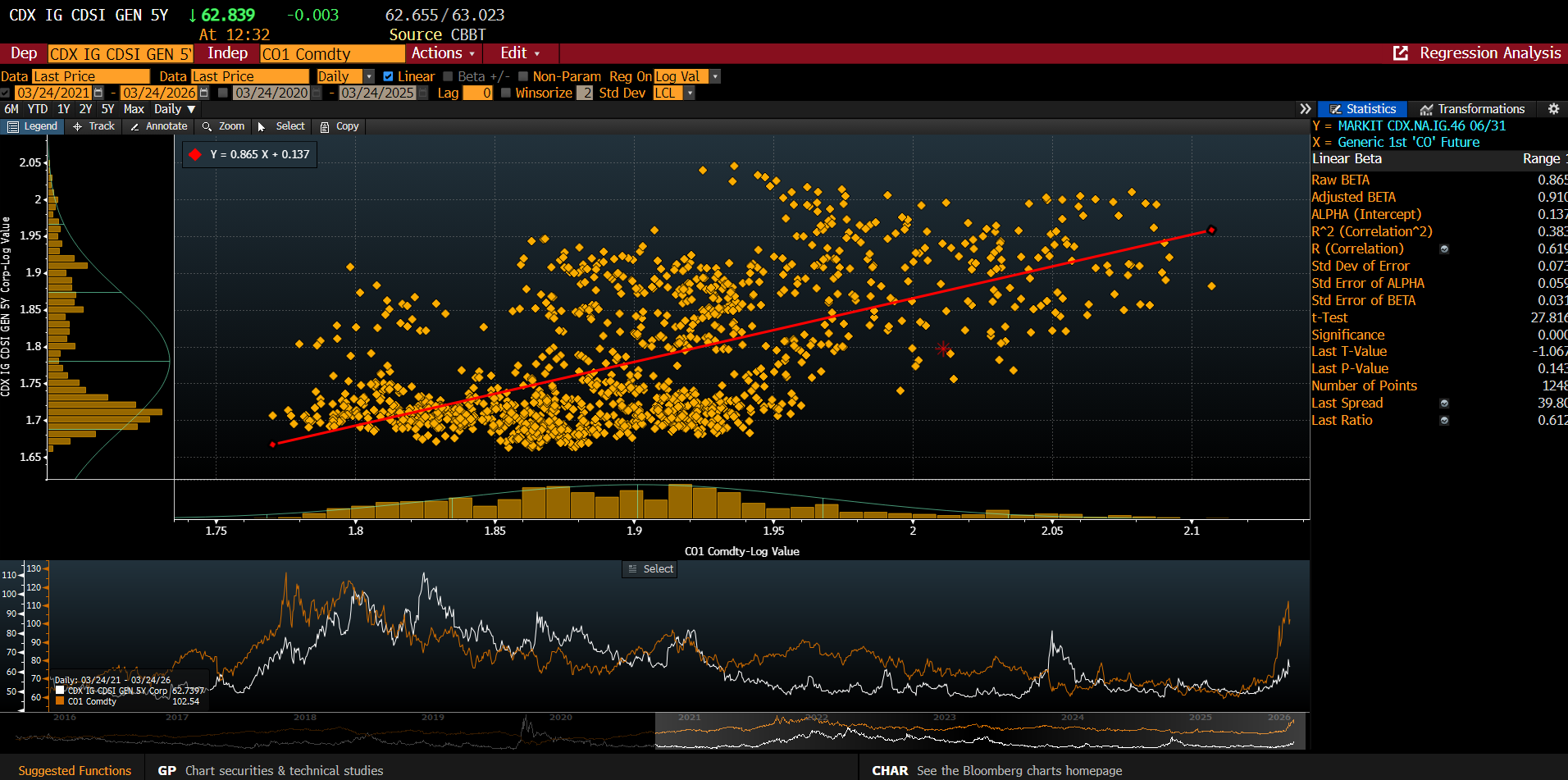 Source for CDX IG Gen 5 Yr Index and Brent Crude Historical Regression Analysis: Bloomberg Terminal as of 3/23/2026