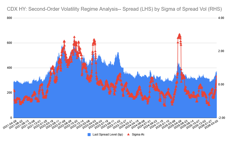 Source: Bloomberg Terminal for Historical CDX HY Gen 5 Yr Index Data, z-score model tested by Google Gemini for as of 3/23/2026.