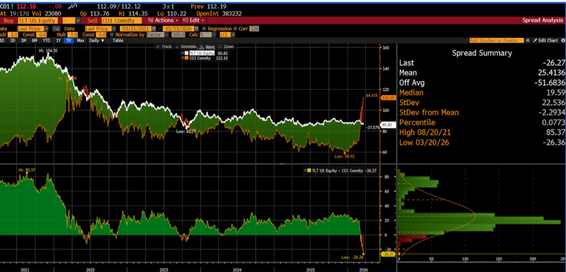 Source: TLT ETF Historical Spread vs Brent Crude Oil Generic Front month Contract from Bloomberg Terminal as of 3/22/2026