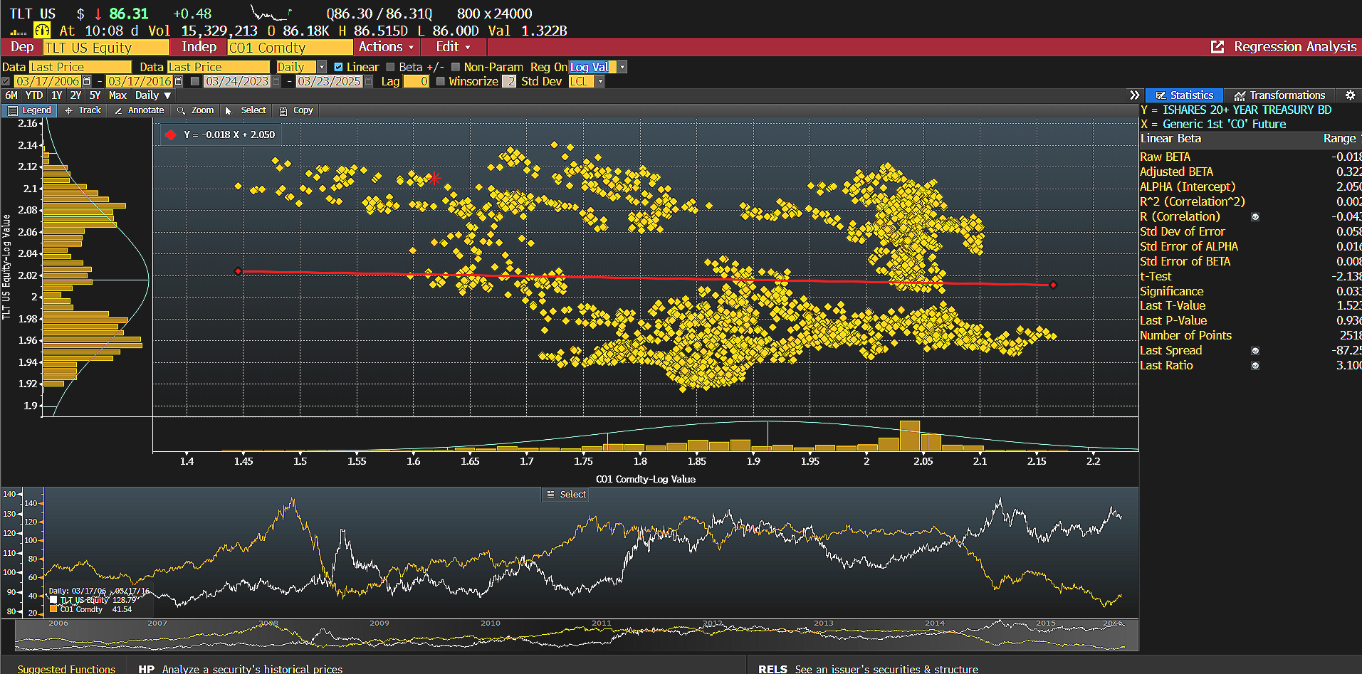 Source: TLT ETF Historical Regression and Spread Analysis vs Brent Crude Oil Generic Front month Contract from Bloomberg Terminal as of 3/23/2026