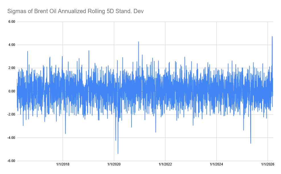 From 1st of March 2026 through Friday 20 March 2026, Brent Crude oil surged nearly 48%— these 16 days represented a 4-6.5 sigma event on a daily Standard Deviation of price change basis depending on rolling look-back (source: Bloomberg Terminal, Google Gemini as of 03/22/2026). On Monday 23 March 2026, just before the market opened, President Trump announced on Fox Business that he plans to postpone any strikes on IRGC energy/power infrastructure for five days to allow for bilateral negotiations to play out: S&P500 is up over 1.34% on the news (source: Bloomberg Terminal as of 1400 HR GMT, 3/23/2026). Breaking market headlines from the White House presents a challenging case for any institutional investor who seeks only to monetize absolute direction, rather than relative volatility of spread tightening or widening. This fog of war investing headwind is most evident with an examination of the volatility of Brent Crude Oil front month futures contracts—
