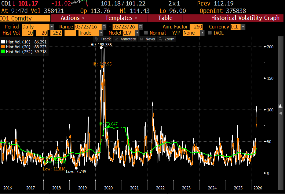 Brent Crude has experienced a 4-6.5 sigma event since the start of the war— but this still pales in comparison to the significant downside volatility experienced at the height of the COVID pandemic, when excess supply and low capacity of storage led to it suddenly trading down to the mid $20s— late 2008 level. Source Bloomberg Terminal HGV Function as of 3/23/2026