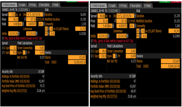 TLT Yield Analysis Screen shows a DV01 $15K per $10,000,005 of notional exposure. A 42bp yield steepening drops the dollar price of TLT to $81 a share— a 6% loss (Source: Bloomberg Terminal as of 3/23/2026). Therefore, smart structurally long index tracking managers likely view this long bond beta management exercise as worthwhile given capping upside risk if yields tighten to 17bp to be the less of two evils for this 17 year duration asset.