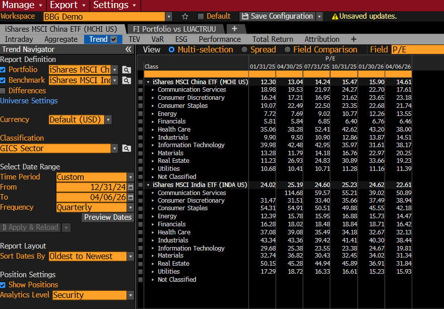 MCHI ETF Trades at over a 20% P/E Multiple Discount to INDA ETF (MSCI India) per Bloomberg PORT Analysis