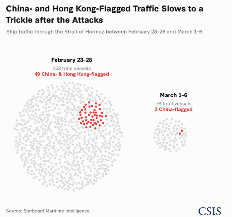 “The unknown unknown” now is a factor of how long the Strait of Hormuz will remained closed to to IRGC targeting and what the second and third order impacts will be on PRC ties to the global economy. Thus, institutional investors may very well have to plan for the probability that this time may be much different than 2003. As CSIS has cogently described the unthinkable just eight months ago– the IRGC has closed the Strait of Hormuz where even its key client state, People’s Republic of China has had difficulty getting its flagged LNG/Oil vessels through. The CSIS points out that the IRGC has been targeting ships in the Strait of Hormuz– contributing to over a 90% decline in PRC and Hong Kong Flagged ships getting through. This signals to the world that the PRC’s massive economy may be experiencing a commodity shock soon, and its lofty foreign investment may then begin to slow down vs. expectations prior to the war.