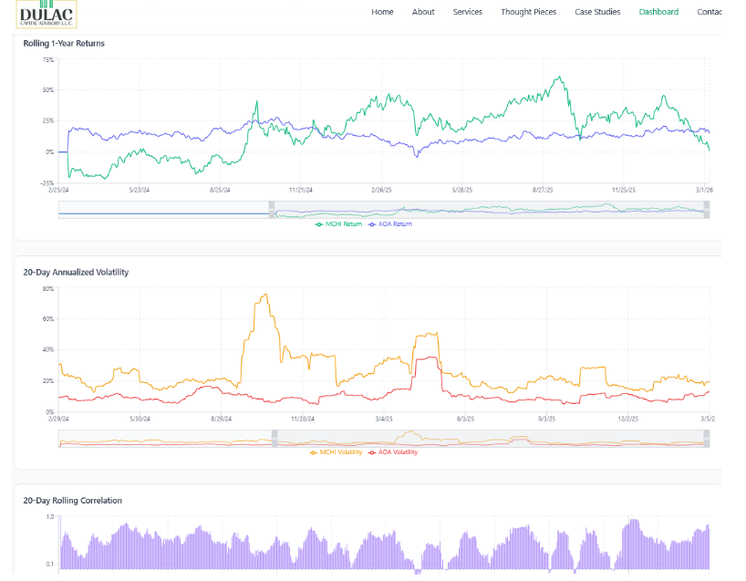 MCHI Correlation has increased with AOA: and risk adjusted return Trends have Deteriorated– This doesn’t Bode Well for Portfolio Utility until Signs of Easing of fthe Closure of the Strait of Hormuz Emerge