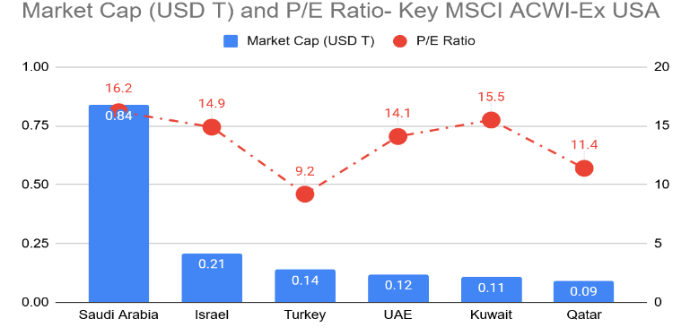 Too Big to Ignore: GCC States & Israel such as KSA and UAE have much lower P/Es than broader MSCI ACWX-USA (~19X)
