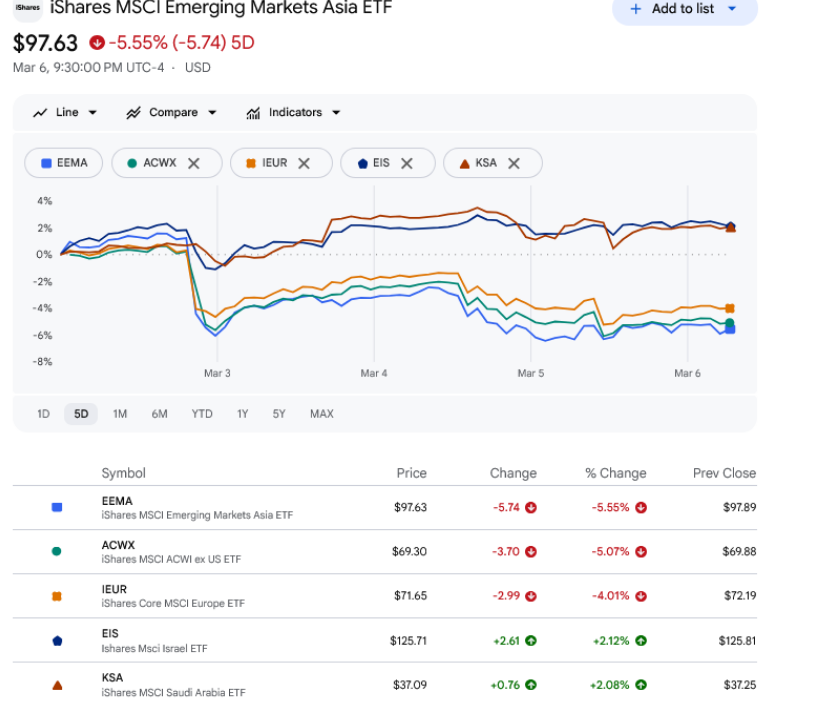 Meanwhile, following the war’s outbreak last Saturday (3/2/2026) as DuLac Capital Advisory L.L.C. projected on 3/2/2026 that many institutional investors hedged their commodity sensitive MSCI EM Asia (e.g., iShares MSCI EM Asia ETF: EEMA ) by incorporating various barbell strategies with the most liquid beta instruments for both MSCI Israel: e.g.,iShares MSCI Israel capped IMI ETF: EIS. And MSCI Kingdom of Saudi Arabia (capped IMI): e.g, iShares MSCI Saudi Arabia ETF: KSA.