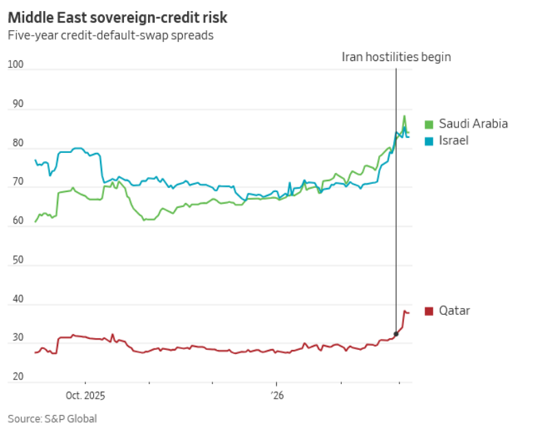 Below is a chart from the WSJ regarding the uptick in sovereign bond CDS for Kingdom of Saudi Arabia, Qatar, UAE, and Israel– don’t be surprised if the Trump Administration announces a “Brady Bond Redux” to help offset sovereign risk for its key Mideast allies.