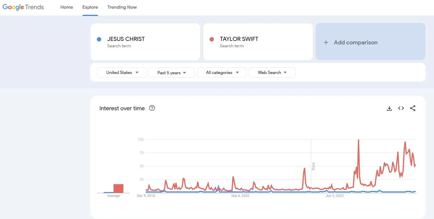 Google Trends Comparison: Jesus Christ vs Taylor Swift Google Trends Index (12/08/23)