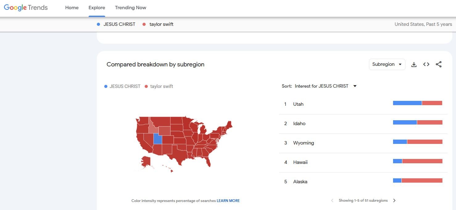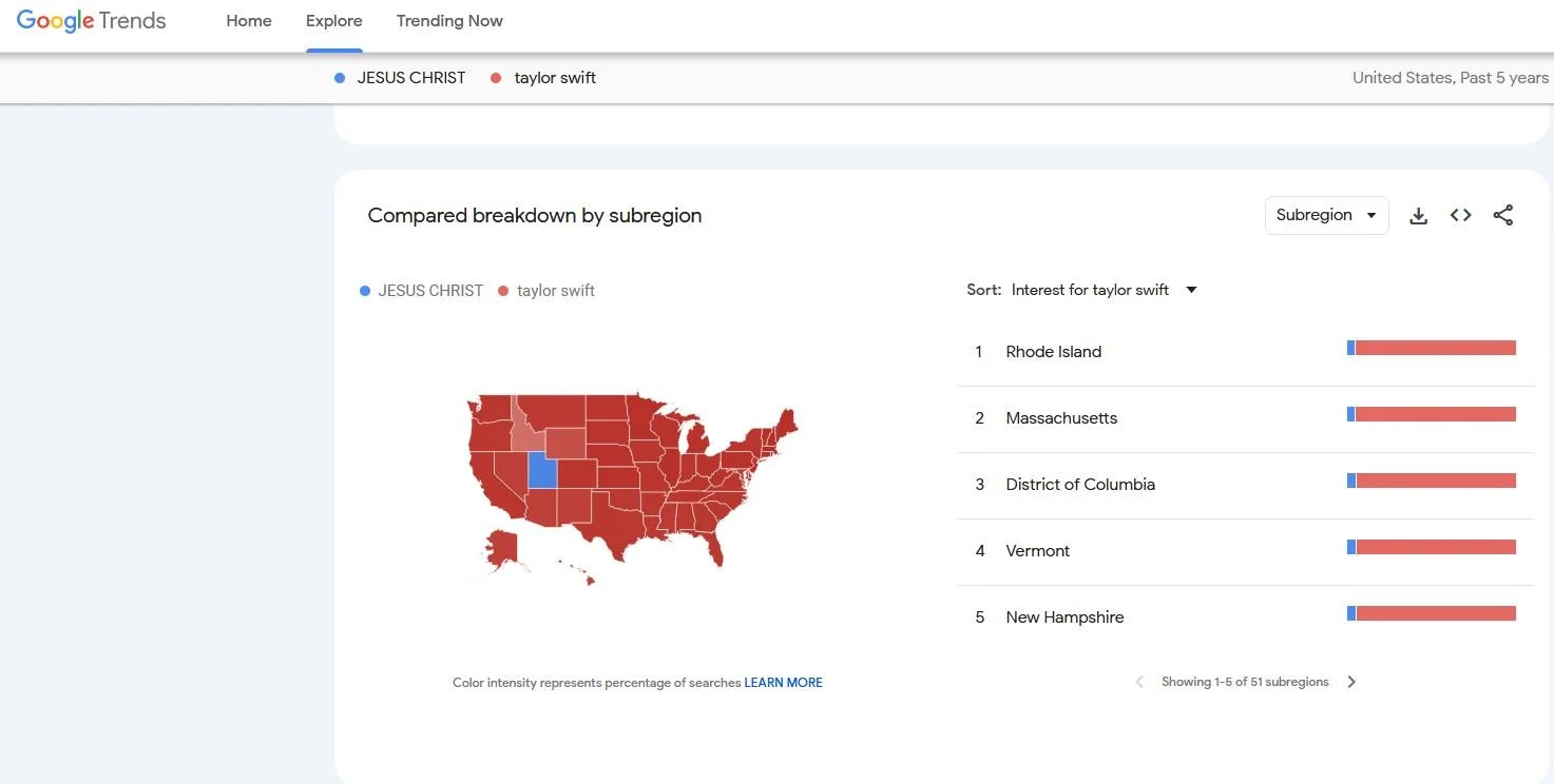 Given the controversy the Beatles, and Rock & Roll in general, created in much of the South and Plains State Midwest 60 years ago, it may be examine a monthly update on Google Trends comparing the search demand for "Jesus Christ” vs. “Taylor Swift”— and filtered down to region.
